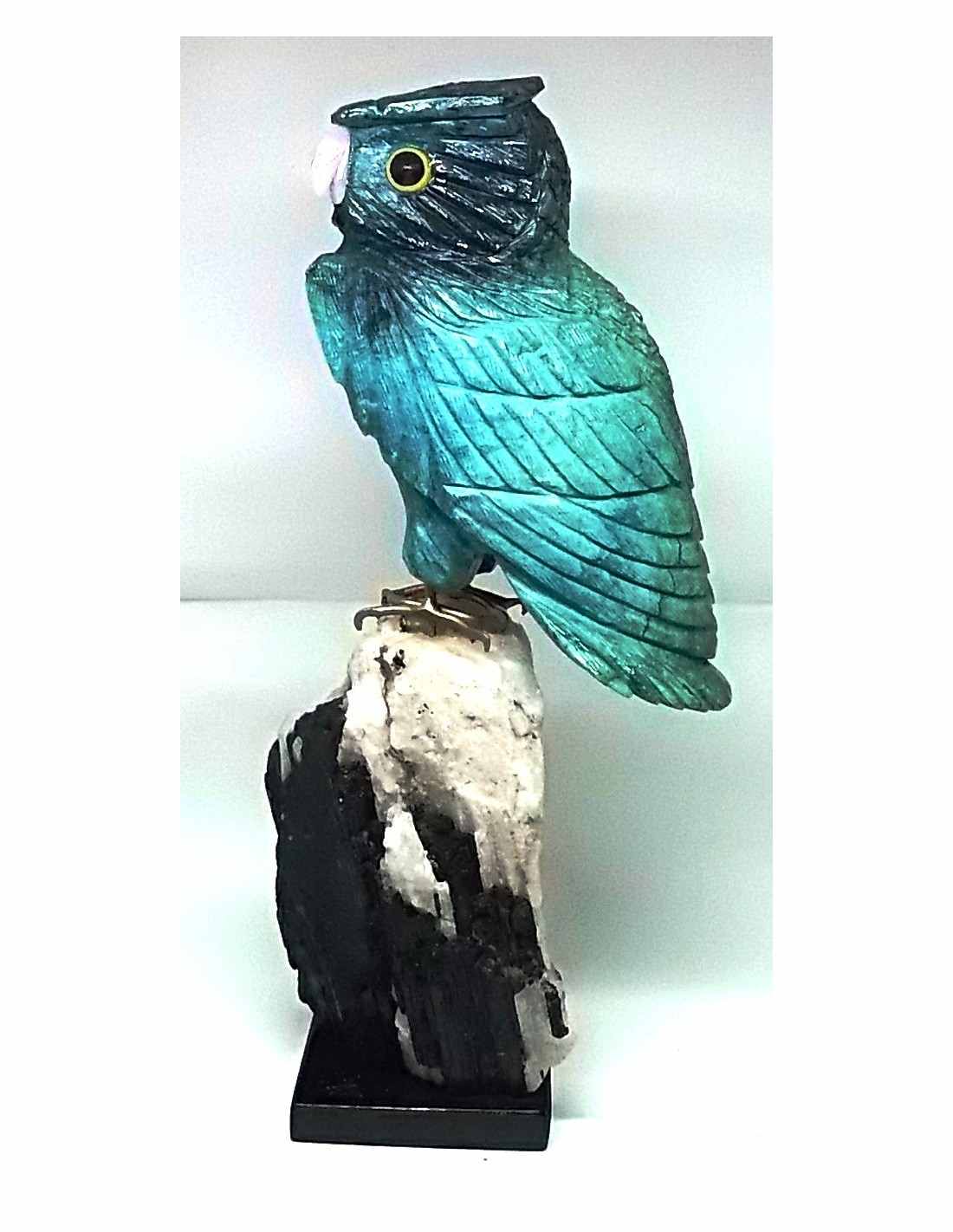 - Une œuvre d'art unique alliant la sagesse du Hibou à la puissance protectrice des minéraux les plus nobles. Grand hibou en chrysocolle, sur grande base de quartz avec tourmaline noire. Hauteur totale 32cm, hibou 14cm, longueur 29cm, largeur corps 9cm, base quartz aux tourmalines noire hauteur 17cm, largeur 10,5cm, poids total 4,196g.