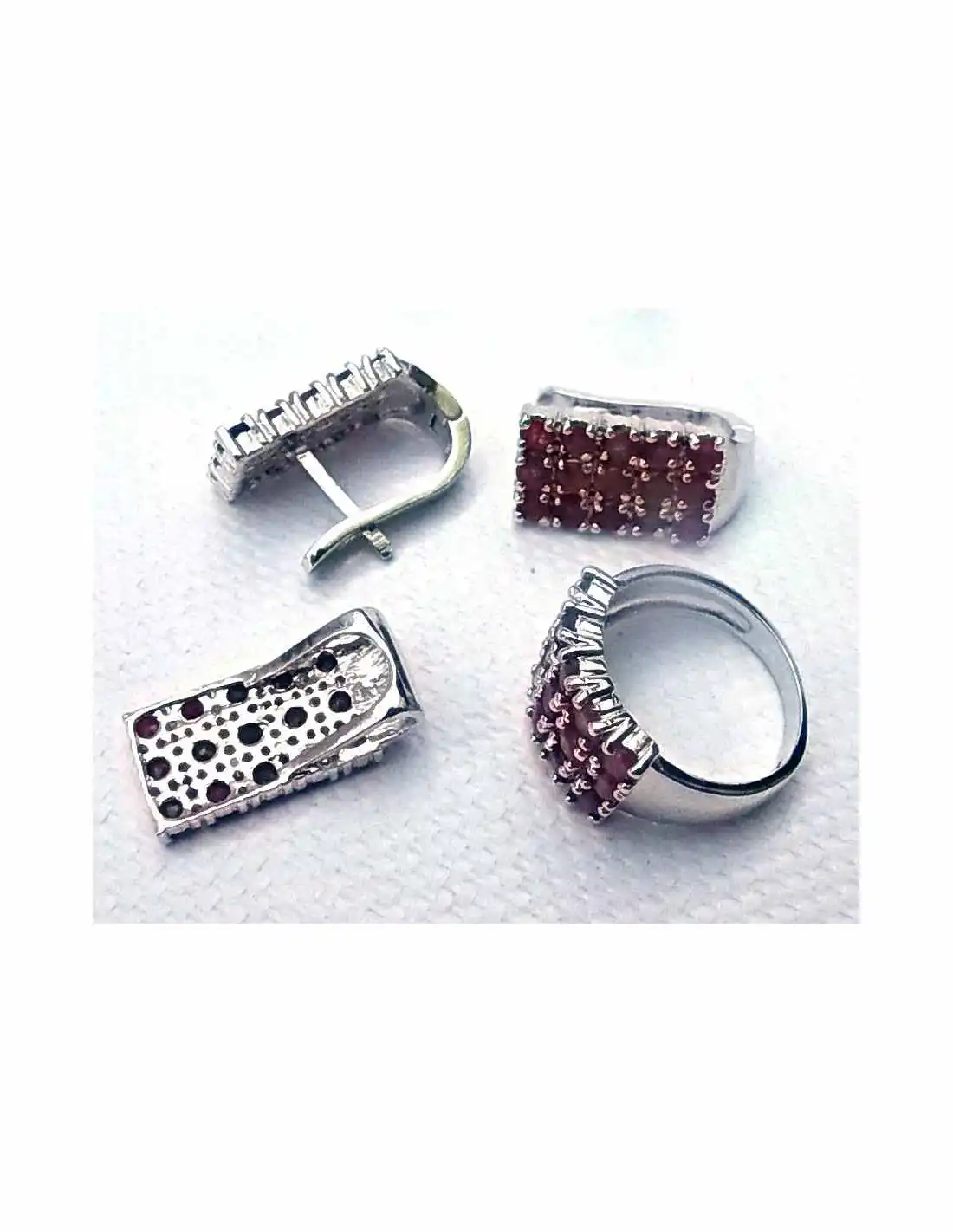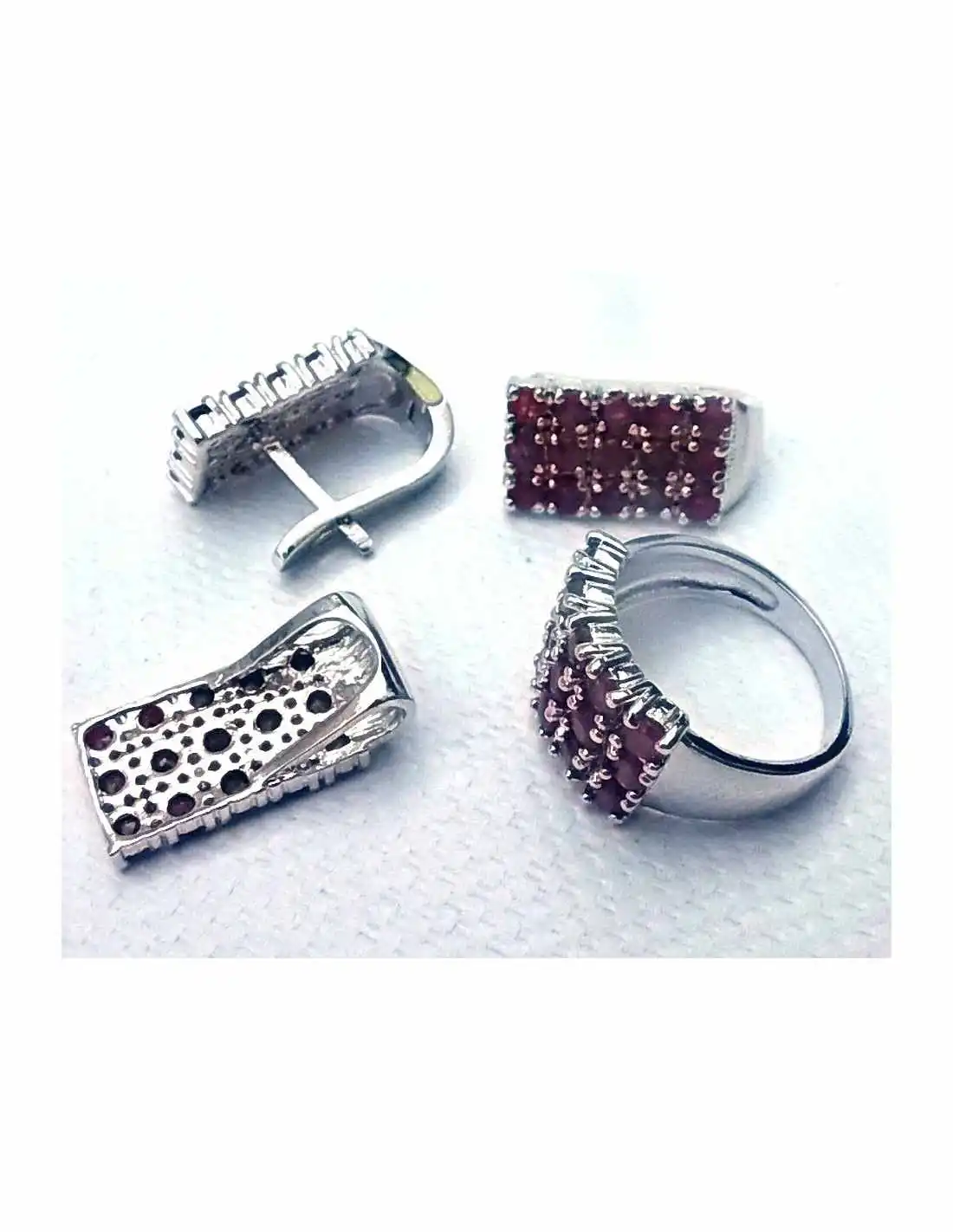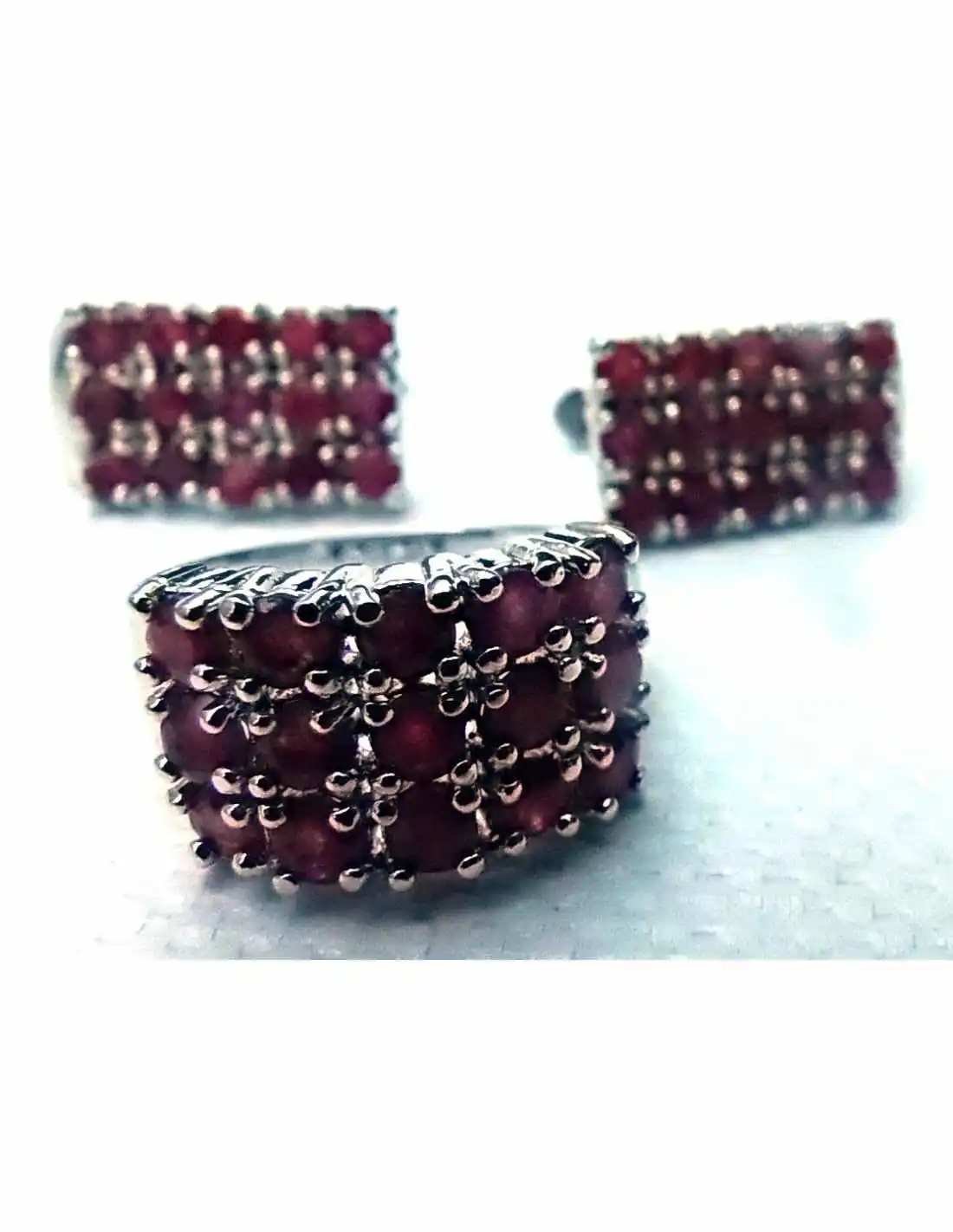 Parure Complète en Rubis et Argent; Magnifique parure en rubis ensemble, pendentif, boucles et bague monté en argent. Certifié. totalisant 60 Rubis qualité gemme. Pierre précieuse.