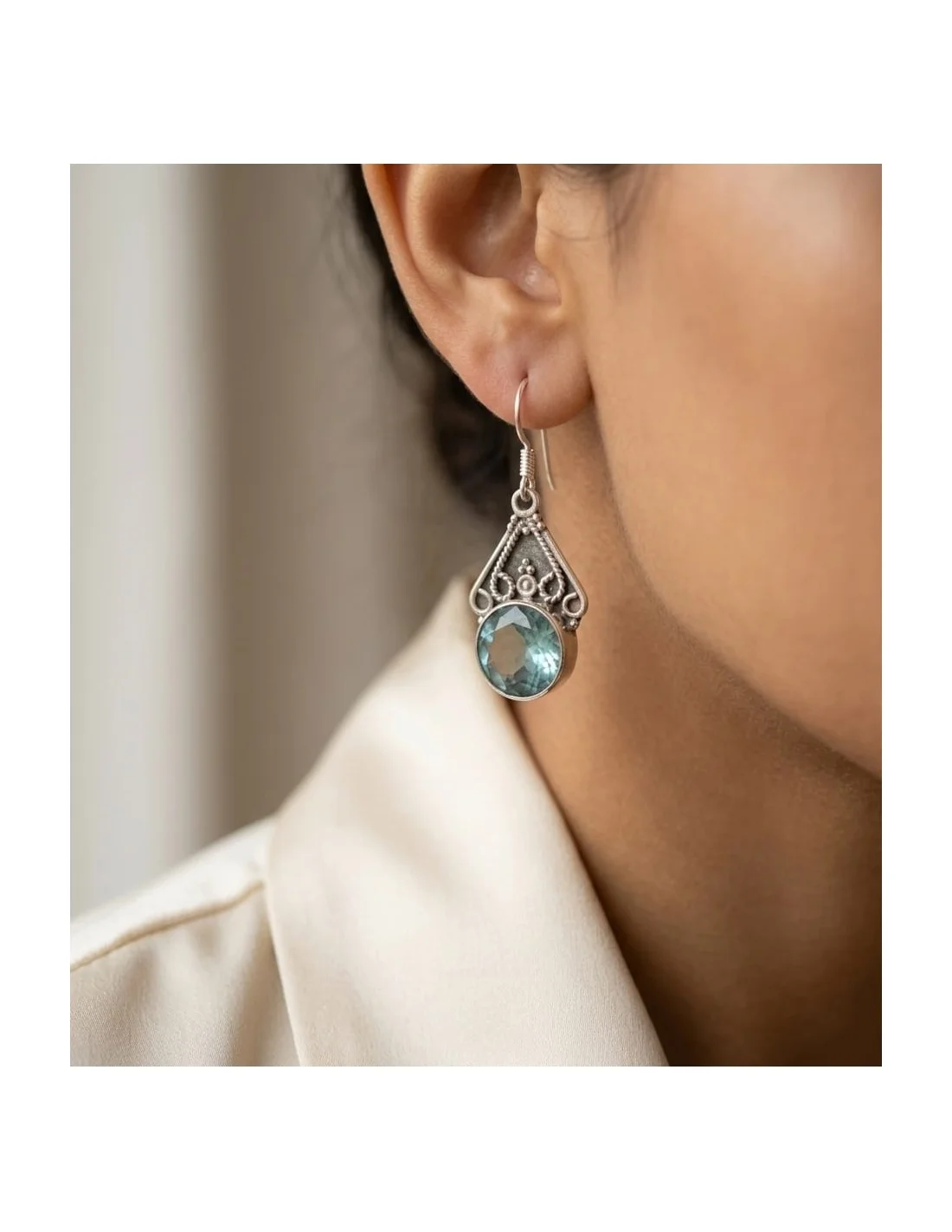 Sublimez votre visage avec ces magnifiques boucles d'oreilles en Topaze Bleue naturelle. Montées sur une armature en argent délicate, ces pierres captent la lumière pour offrir un éclat cristallin unique. Alliant élégance et bien-être, elles sont le choix idéal pour celles qui recherchent une pierre de santé et de clarté.