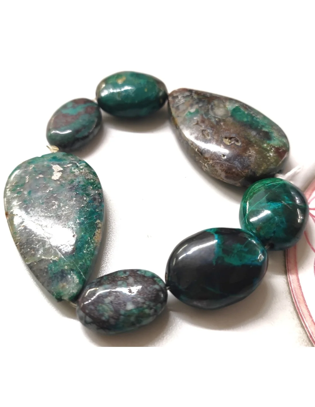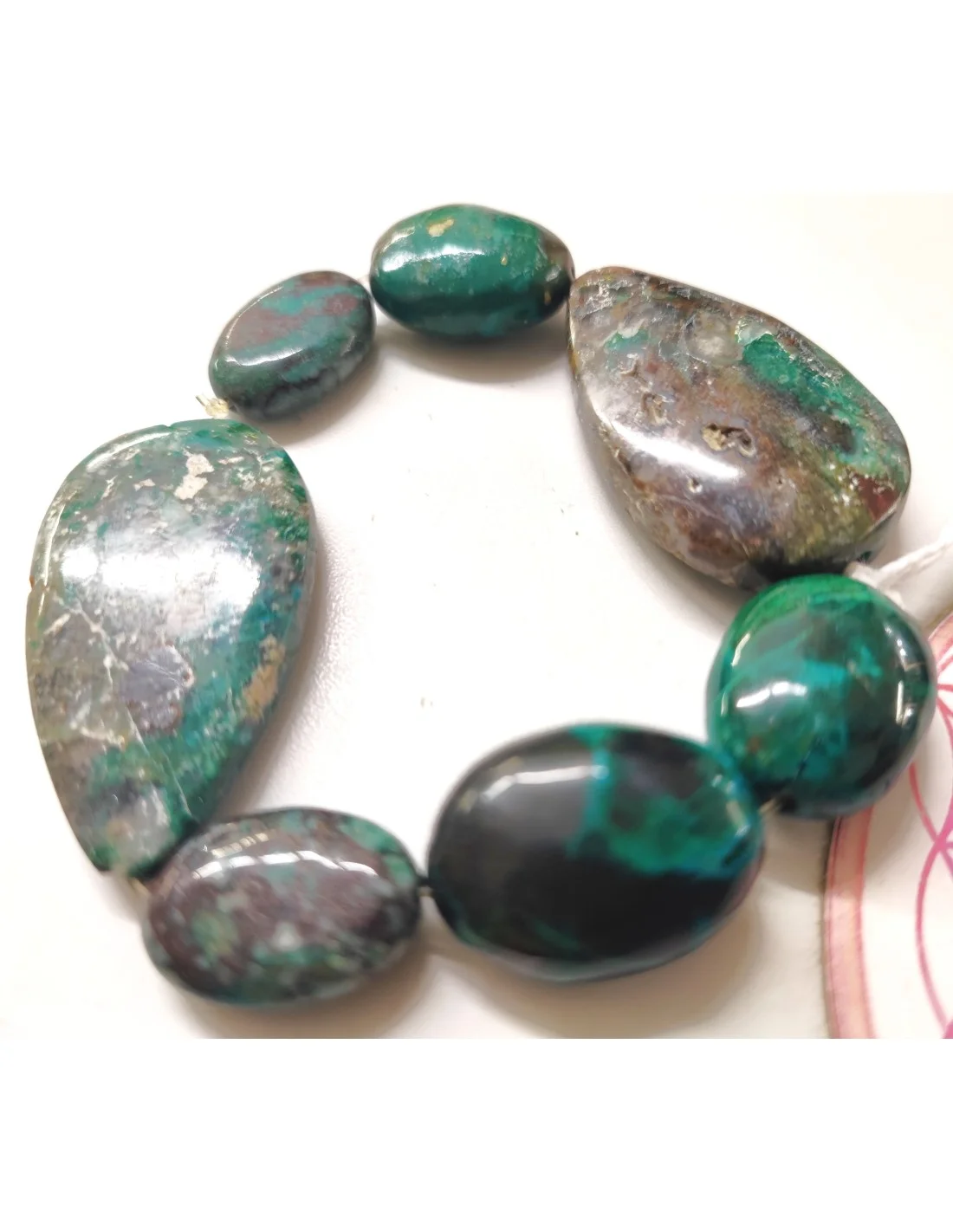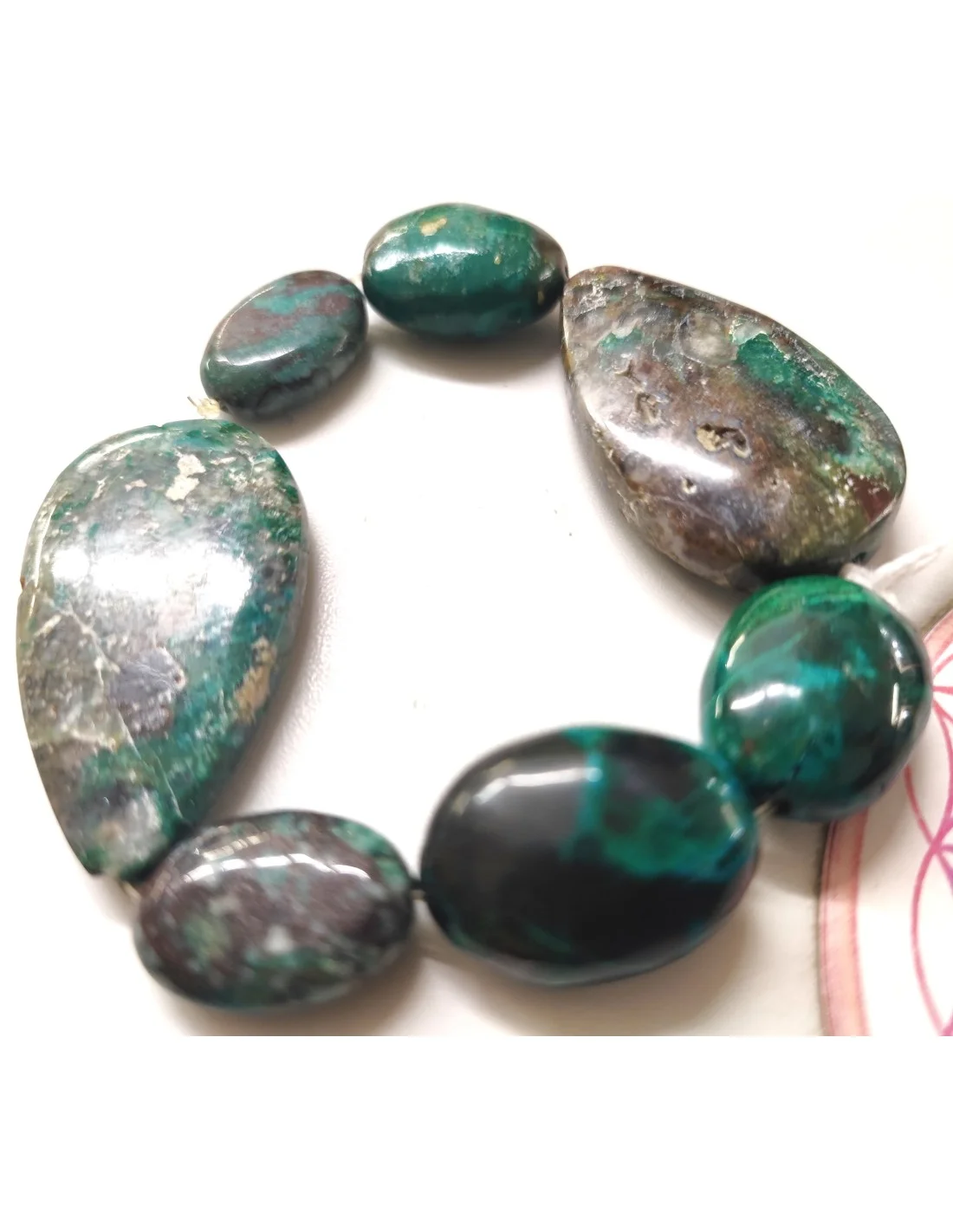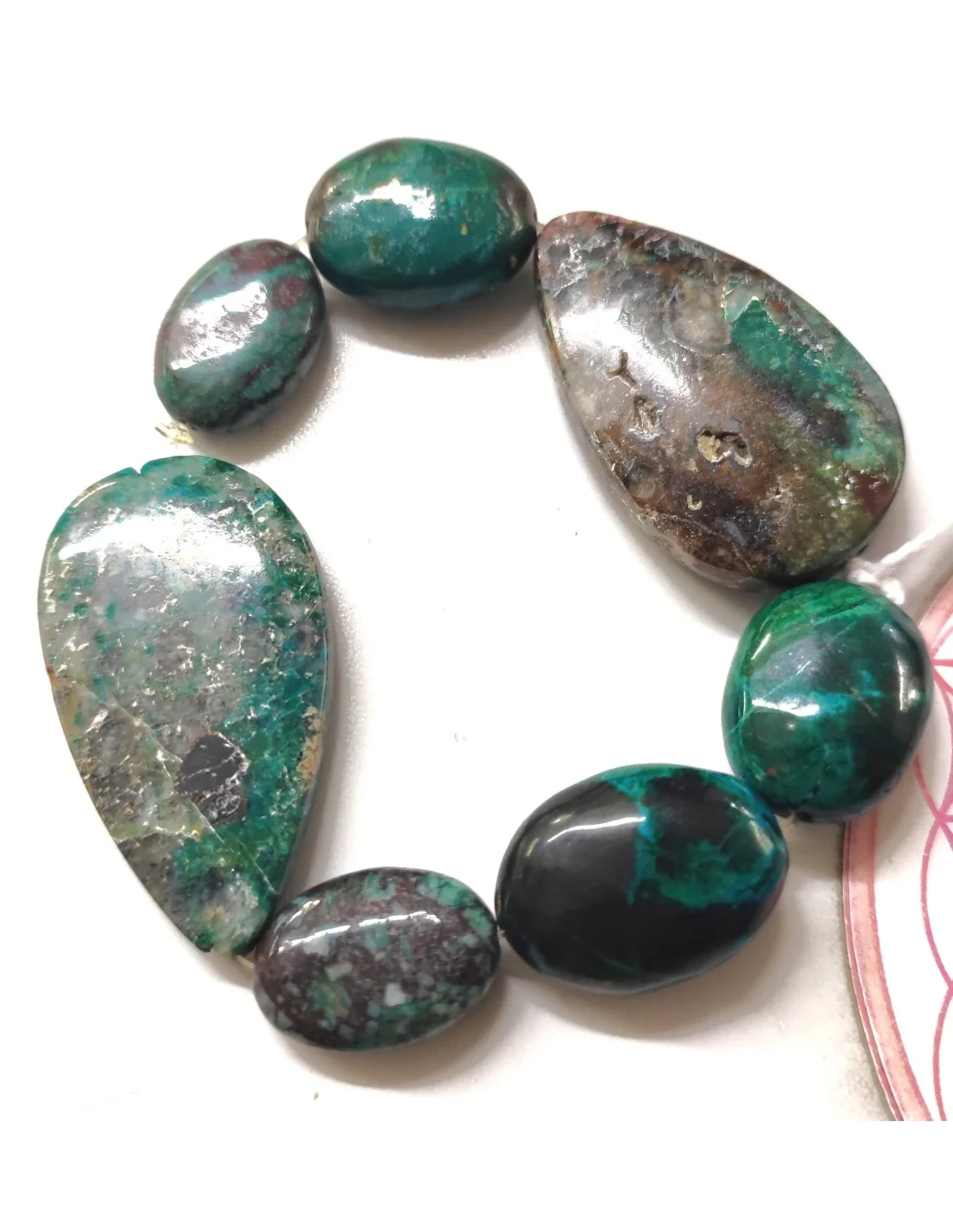 Caractéristique Détail Nom de la Pierre Quattro Quantum (aussi appelé Quartz Quantum, Quatro Quartz) Origine Namibie Composition Shartuckite, Dioptase, Malachite, Chrysocolle, Quartz Fumé Longueur du Bracelet 17 cm Dimensions des Pierres Forme de Goûte 3,5 cm ( 35mm ) Ovale : de 1,7 a 2 cm cm (17 à 20 mm) Poids 37g Type de Produit Bracelet en pierres naturelles (perles ovales et rectangulaires) 🌟 Bienfaits Énergétiques et Spirituels (Lithothérapie)