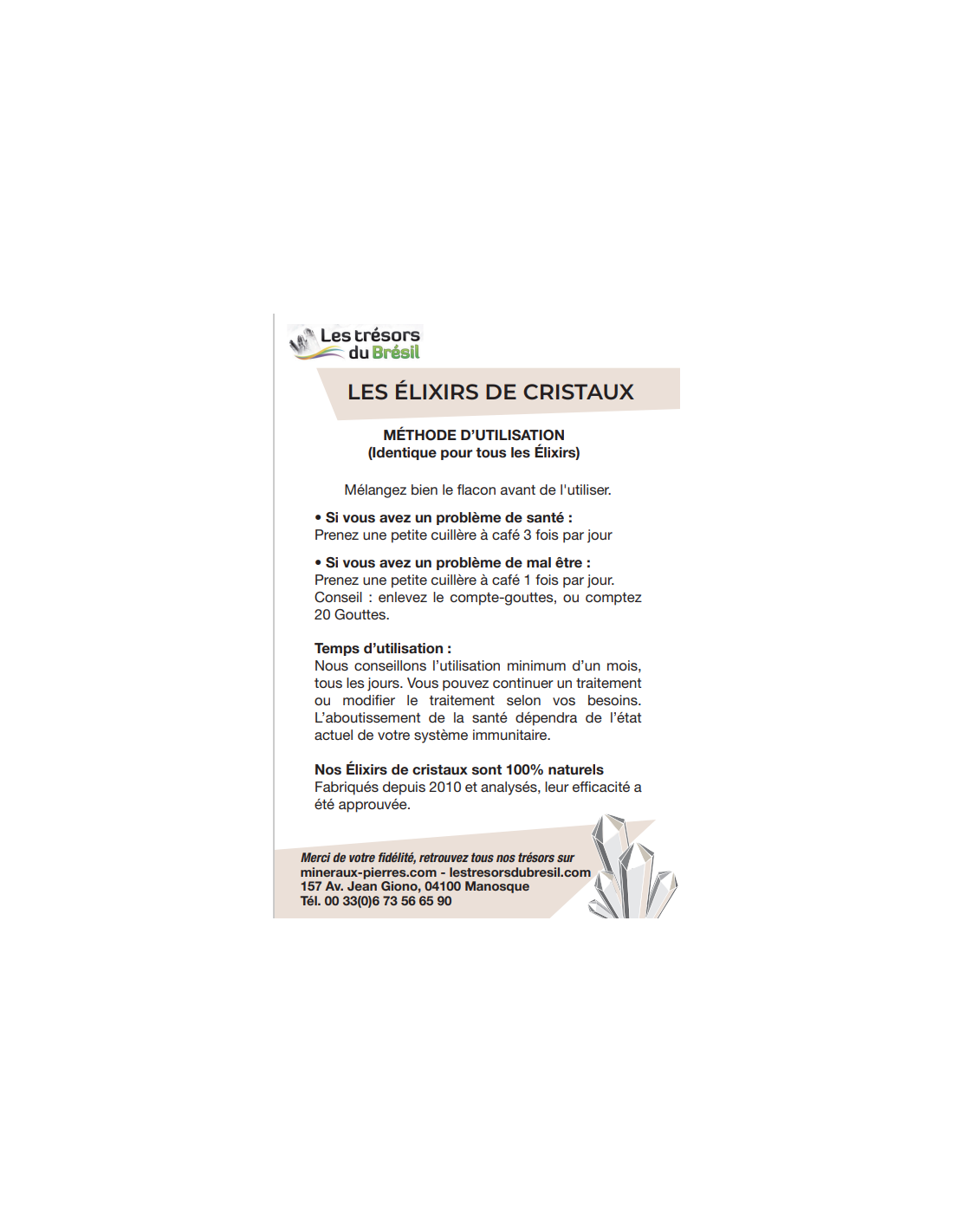 1. Elixir en azurite 100ml. Eau minérale et azurite. Anti-douleurs, anti-stress, aide le système immunitaire, élimines le stress émotionnel, physique et psychologique.
