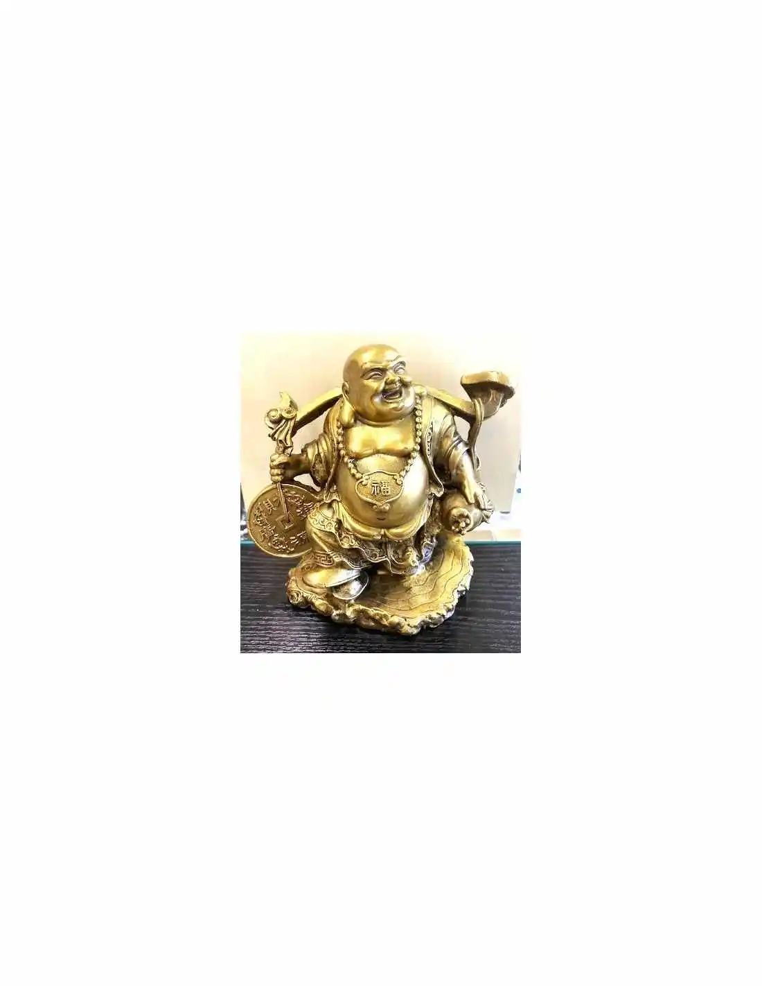 Découvrez cette superbe statue de Bouddha de l'Abondance, également connu sous le nom de Bouddha Rieur (Hotei ou Budai). Cette sculpture est réalisée en laiton massif et recouverte d'une finition dorée brillante, capturant l'énergie positive et la joie qu'elle est censée apporter.