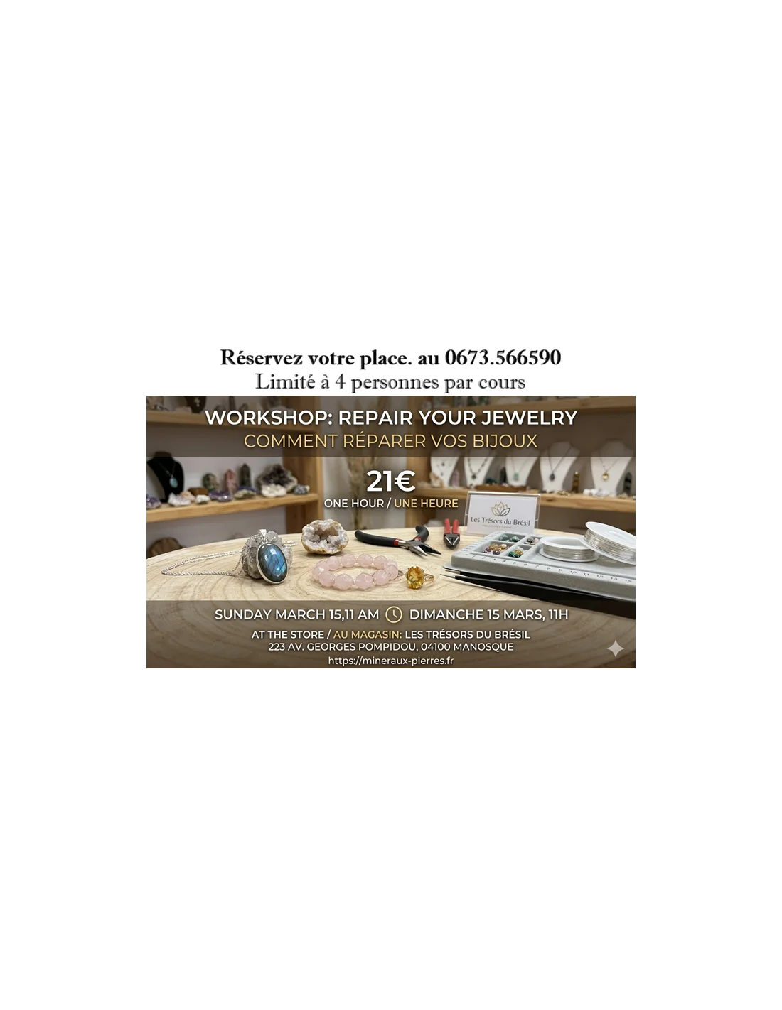 Apprenez à réparer vos bijoux en 1h pour seulement 21€ ! Rejoignez notre atelier exclusif le dimanche 15 mars à 11h au magasin Les Trésors du Brésil à Manosque. Inscription en ligne ou au 223 Av. Georges Pompidou. Donnez une seconde vie à vos trésors !