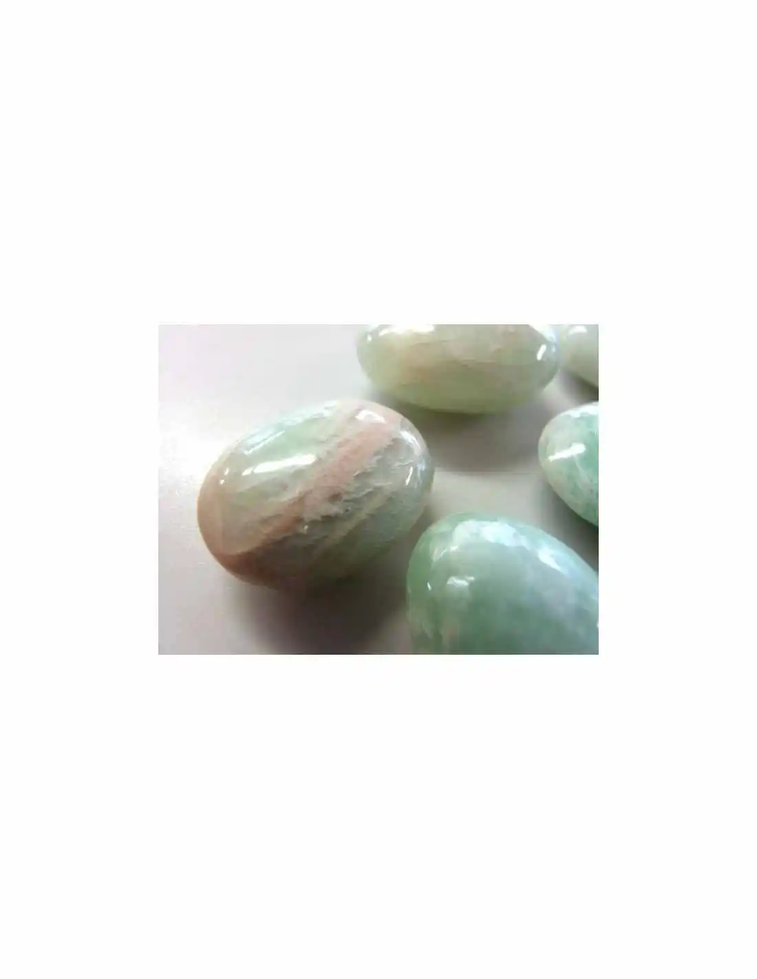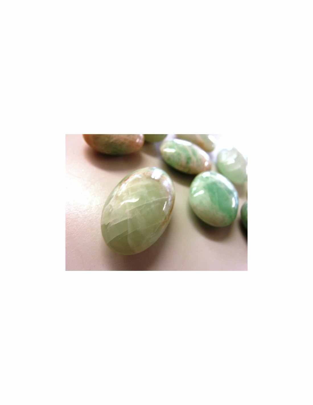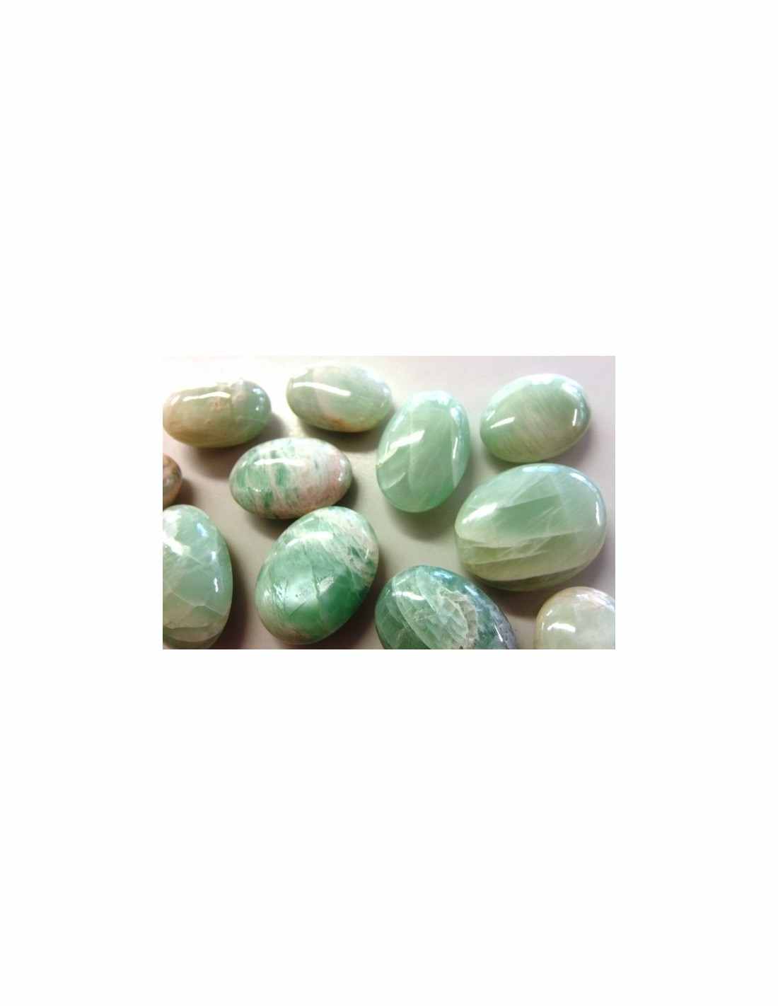 Pierre de lune verte galet. Longueur de 2,5 à 3,5cm, poids de 11 à 20g. Apaise les émotions, favorise l'état de guérison.